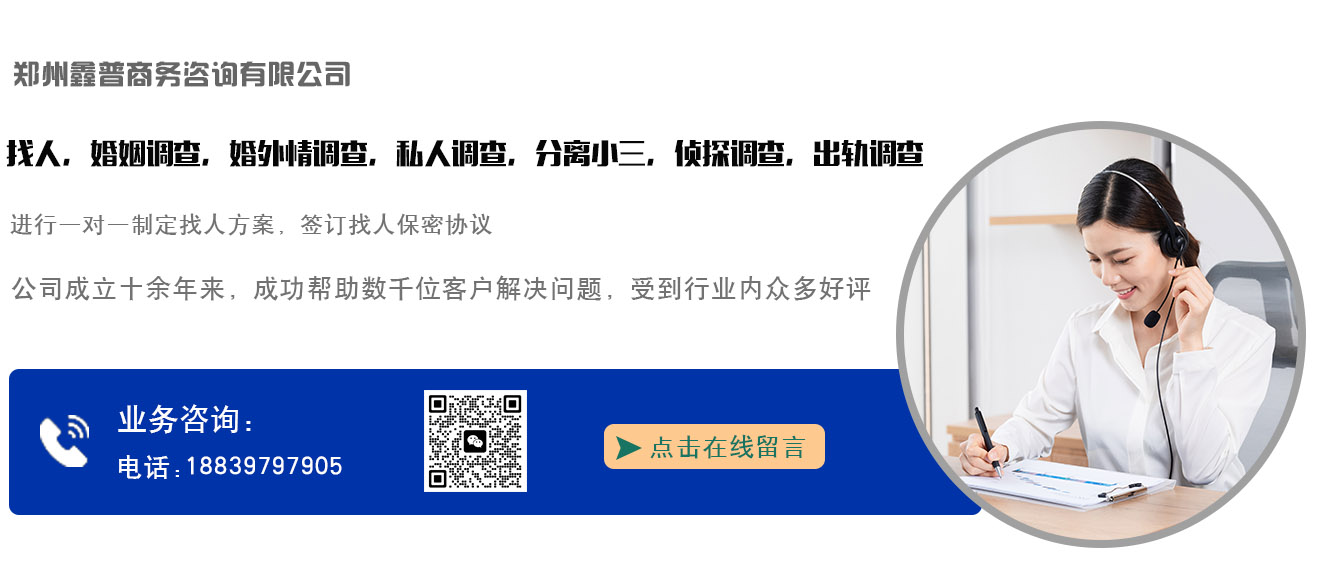 鄭州鑫普商務咨詢有限公司18839797905是一家立足于河南鄭州找人公司,正規合法尋車找人公司,公司服務范圍包括,婚姻調查,調查婚外情,私人調查,小三分離,偵探調查,出軌調查,跟蹤找人、尋人查址、手機的定位找人、尋人找車、要賬討債等。鄭州找人公司成立十余年來,成功幫助數千位客戶解決問題,受到行業內眾多好評。鄭州找人公司根據客戶的實際情況進行一對一制定找人方案,簽訂找人保密協議,不必擔心自己隱私泄露,同時我們鄭州找人公司承諾見人后收費,價格合適,找人費用劃算,一切以客戶利益為出發點。